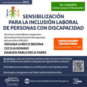 Nueva cohorte CURSO VIRTUAL SENSIBILIZACIÓN PARA LA INCLUSIÓN LABORAL DE PERSONAS CON DISCAPACIDAD Curso virtual asincrónico, con avance a ritmo propio —CAPACITACIÓN OBLIGATORIA - ... 27 Oct 19:00