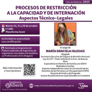 Ciclo de Webinars PROCESOS DE RESTRICCIÓN A LA CAPACIDAD Y DE INTERNACIÓN. Aspectos Técnico-Legales 👤 A cargo de MARÍA GRACIELA IGLESIAS Abogada Secretaria Ejecutiva del Órgano ... 21 Oct 17:00 - 17:00