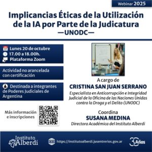 Webinar Implicancias Éticas de la Utilización de la IA por Parte de la Judicatura —UNODC— 👤 A cargo de CRISTINA SAN JUAN SERRANO Especialista en Anticorrupción e Integridad ... 20 Oct 17:00