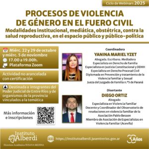 Ciclo de Webinars PROCESOS DE VIOLENCIA DE GÉNERO EN EL FUERO CIVIL. Modalidades institucional, mediática, obstétrica, contra la salud reproductiva, en el espacio público y público-política 👤 Coordinadora: YANINA MARIEL YZET Abogada. Escribana. Mediadora Especialista en Derecho de ... 05 Nov 17:00