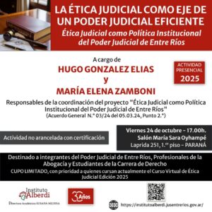 Actividad Presencial: LA ÉTICA JUDICIAL COMO EJE DE UN PODER JUDICIAL EFICIENTE. Ética Judicial como Política Institucional del Poder Judicial de Entre Ríos Jornada de cierre del Curso Virtual de Ética Judicial - ... 24 Oct 17:00