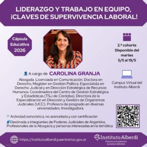 2.ª cohorte- Cápsula Educativa LIDERAZGO Y TRABAJO EN EQUIPO, ¡CLAVES DE SUPERVIVENCIA LABORAL! 👤 A cargo de CAROLINA GRANJA Abogada Licenciada en Comunicación Doctora en Derecho Magíster ... 05 May 19:00 Campus Virtual del IA