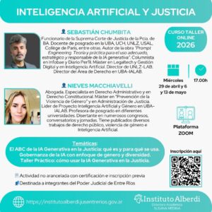 Curso Taller Online INTELIGENCIA ARTIFICIAL Y JUSTICIA 👤 A cargo de SEBASTIÁN CHUMBITA Funcionario de la Suprema Corte ... 29 Abr 17:00 Plataforma ZOOM