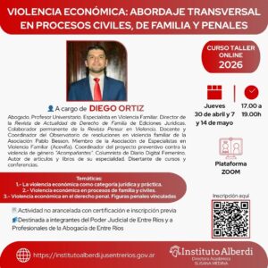 Curso Taller Online VIOLENCIA ECONÓMICA: ABORDAJE TRANSVERSAL EN PROCESOS CIVILES, DE FAMILIA Y PENALES 👤 A cargo de DIEGO ORTIZ Abogado Profesor Universitario Especialista en Violencia Familiar Director ... 07 May 17:00 - 19:00 Plataforma ZOOM