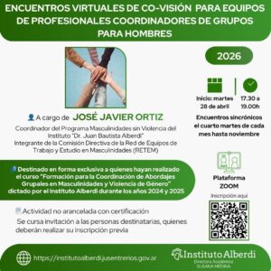 ENCUENTROS VIRTUALES DE CO-VISIÓN PARA EQUIPOS DE PROFESIONALES COORDINADORES DE GRUPOS PARA HOMBRES – 2026 👤 A cargo de JOSÉ JAVIER ORTIZ Coordinador del Programa Masculinidades ... 28 Abr 17:30 - 19:00 Plataforma ZOOM