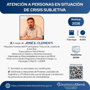 Webinar ATENCIÓN A PERSONAS EN SITUACIÓN DE CRISIS SUBJETIVA 👤 A cargo de JOSÉ E. CLEMENTI Psiquiatra Forense del ETI ... 11 May 17:00 - 19:00 Plataforma ZOOM
